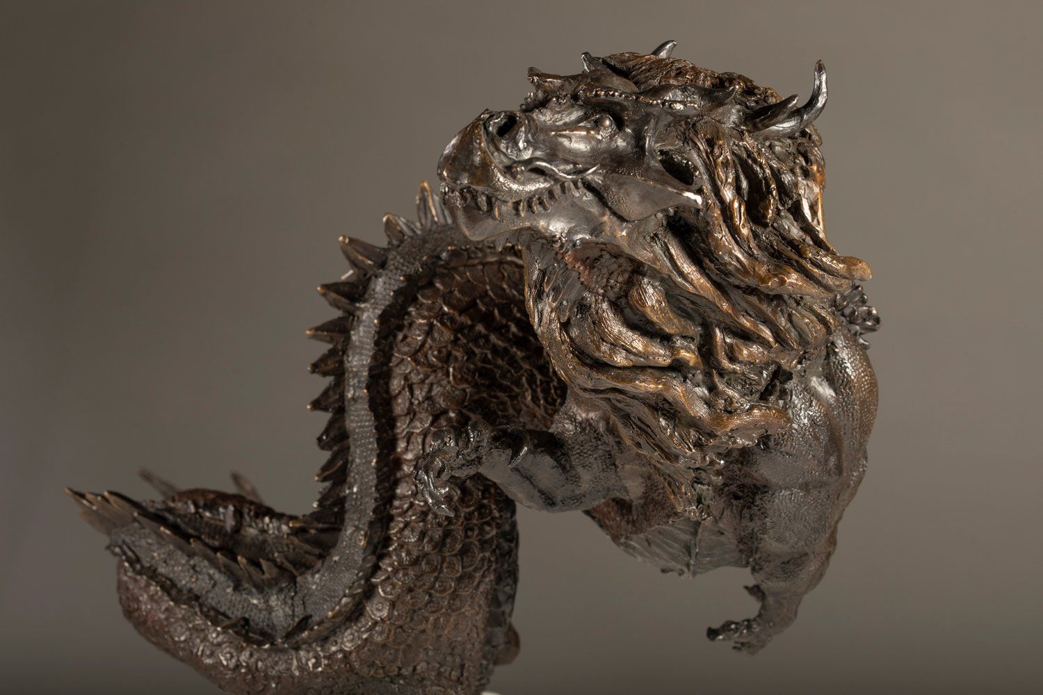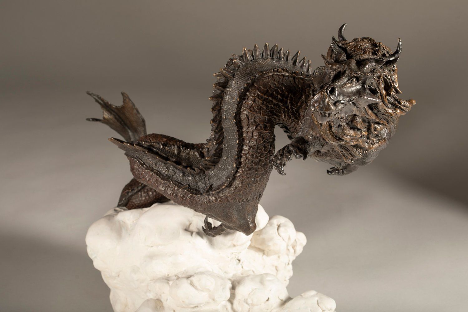 I was very excited to sculpt an eastern or oriental style dragon. All my dragon sculptures up to this point, have been western or European inspired dragons. Western or European inspired dragons typically are portrayed with wings, a massive body and four robust legs. Eastern dragons are something altogether different. They do not have wings, but nevertheless are capable of magical flight. They have a very long serpentine body and legs reduced in size. In researching this sculpture, I researched ancient artwork portraying dragons in the East and traditional descriptions of dragons. While there is quite a bit of variation in their description, there are some commonalities. They are chimeras, that means they are creatures created by combining parts from different organisms. A centaur with the body of horse and torso of a human is an example of this. Eastern dragons often take this several steps further. They are portrayed with the mane of a lion, the tail of a fish, the whiskers of a carp, the antlers of a stag, cow ears and a snake body, just to name a few of their parts. I departed from this traditional description a bit when I sculpted the head. For the head, I was inspired by T-Rex. A fitting head and set of jaws for this powerful creature.